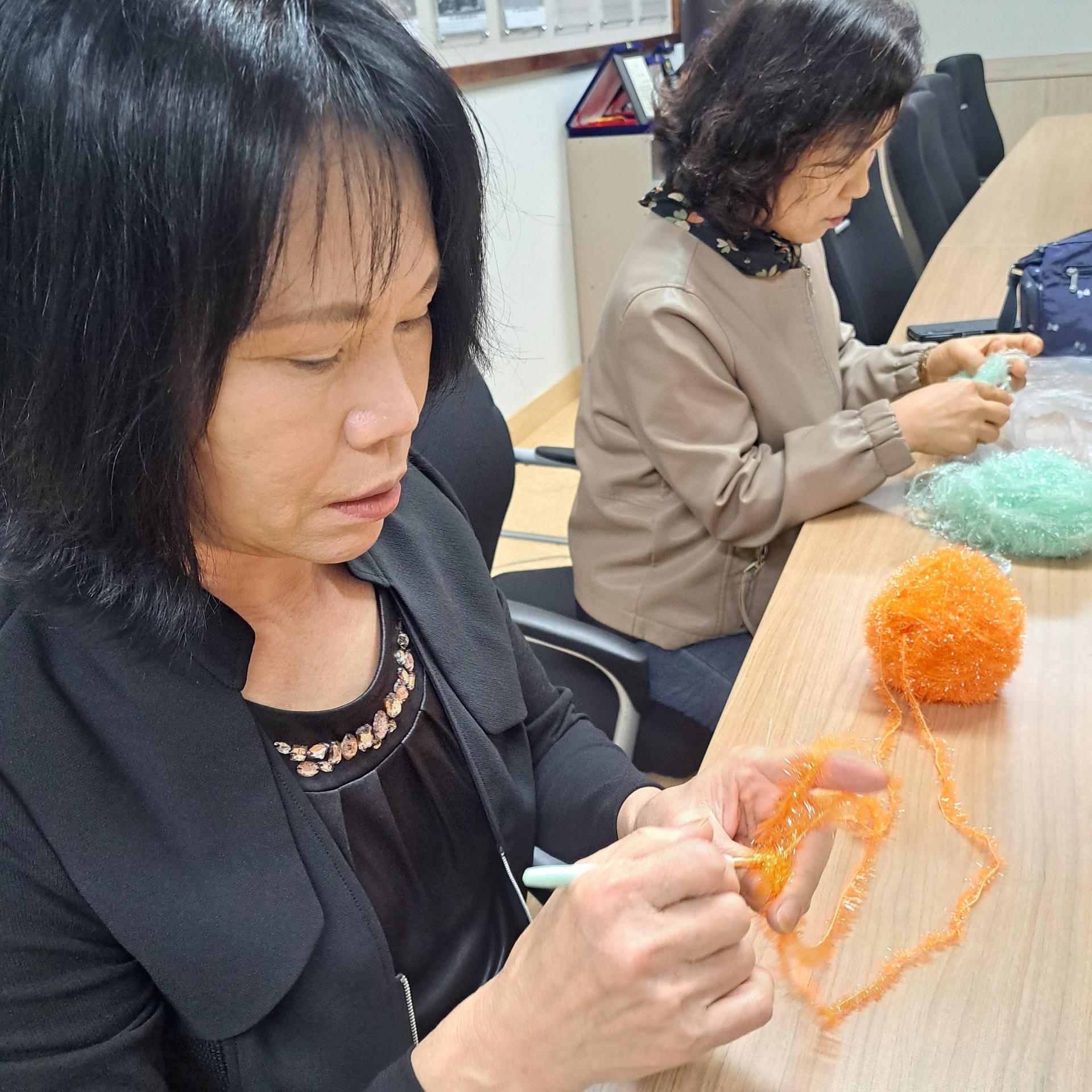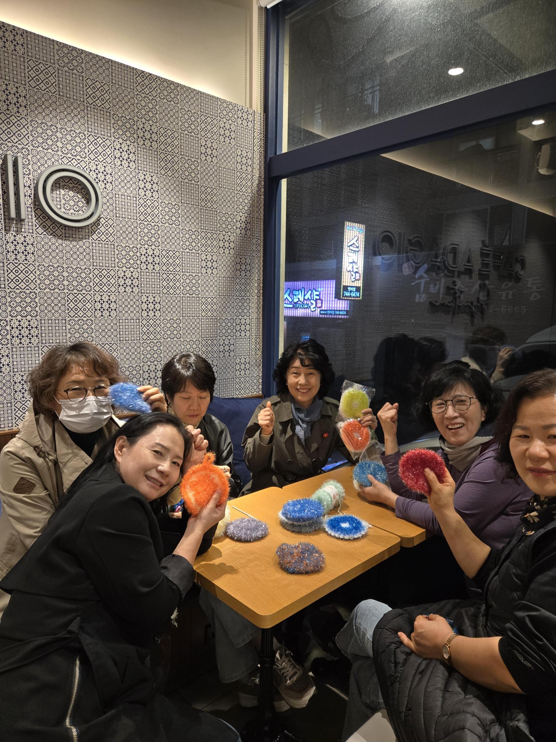 그때의 기억을 떠올리며 여성 위원님들께 우리도 수세미를 떠서 기부해보자고 제안했습니다. 🧶✨