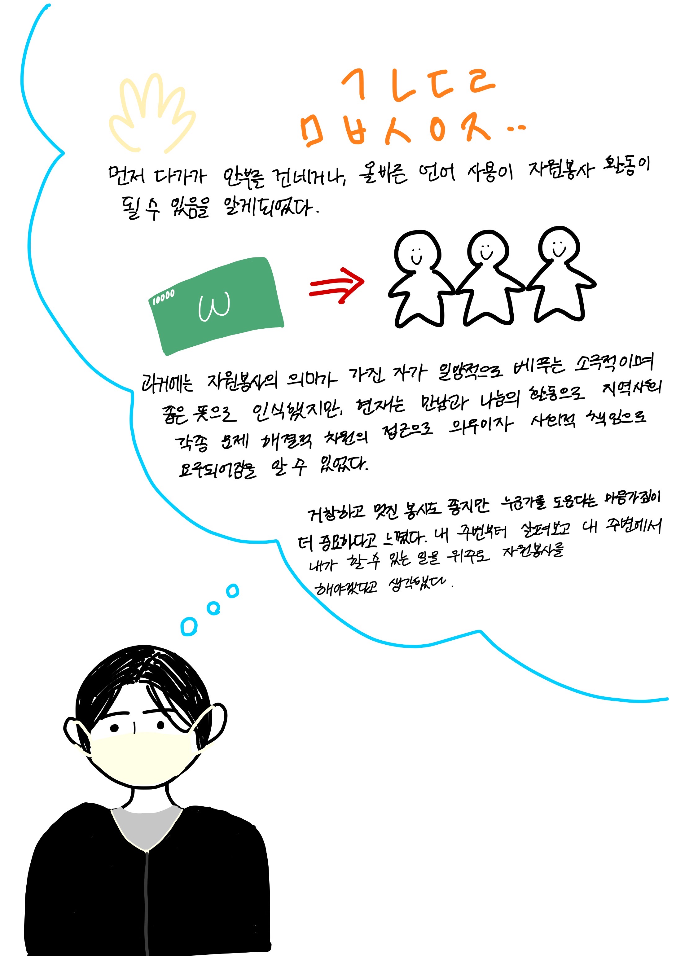 앞으로는 내가 일상생활에서 실천할 수 있는 사소한 배려부터 시작해서 좋은 이웃이 되고 도움이 필요한 사람에게는 용기를 내어 도움을 줄 수 있는 사람이 되로록 노력할 것입니다 :)