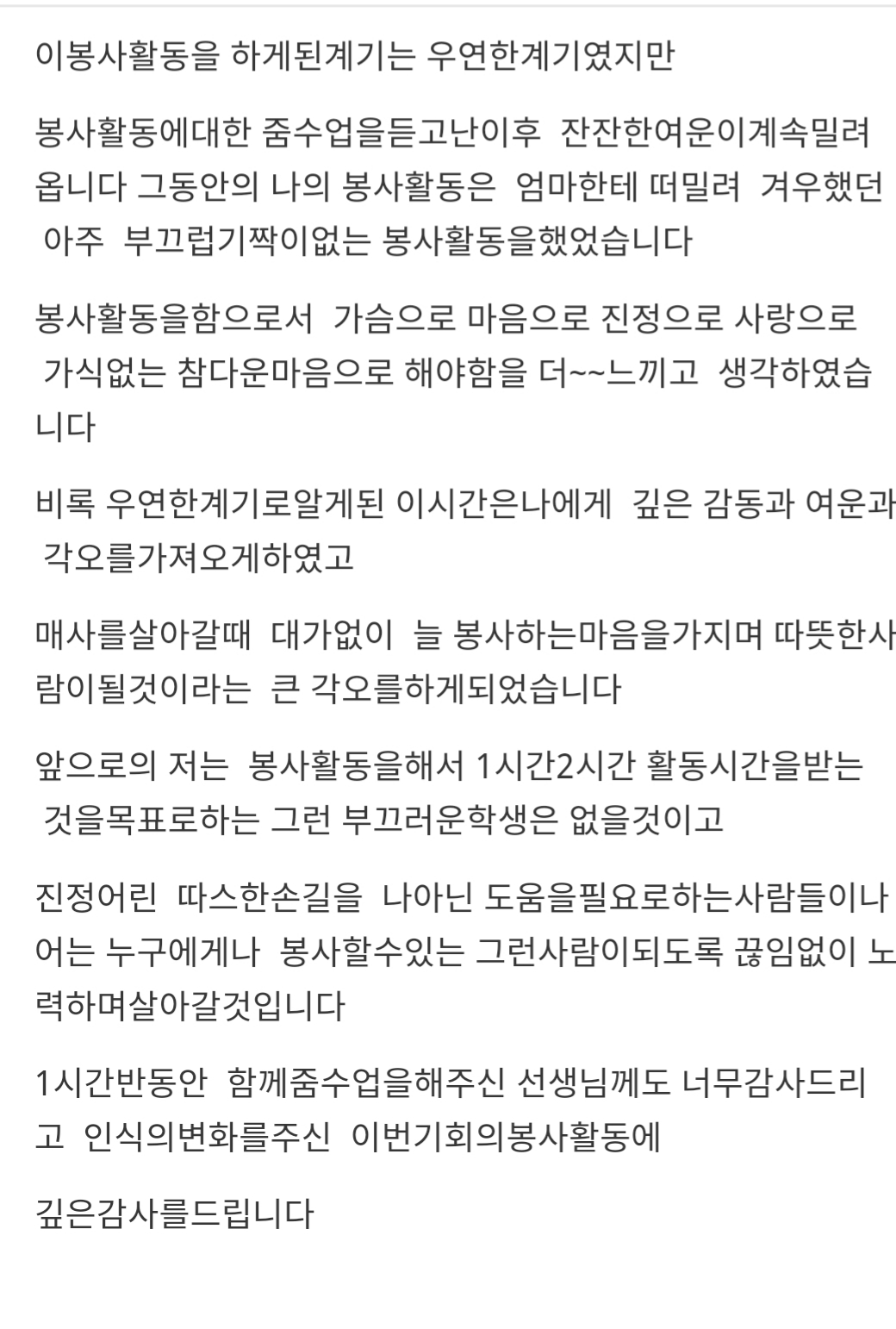 처음에 봉사는 거창한 것이라고 생각했습니다. 요양원에 가서 노인들을 도와주거나 연탄 나르기처럼요. 근데 봉사 활동은 자신이 잘하거나 좋아하는 것부터 시작할수있다는것을 알았습니다. 주변에 어르신에게 친근하게 인사하고, 반에서 친구들과 잘 어울리지 못하는 친구들에게 말을 거는 것도 일종의 작은 봉사라고 생각되었습니다. 앞으로 소소한 봉사부터 시작하여 저와 주변이 모두 행복해 졌으면 좋겠습니다.