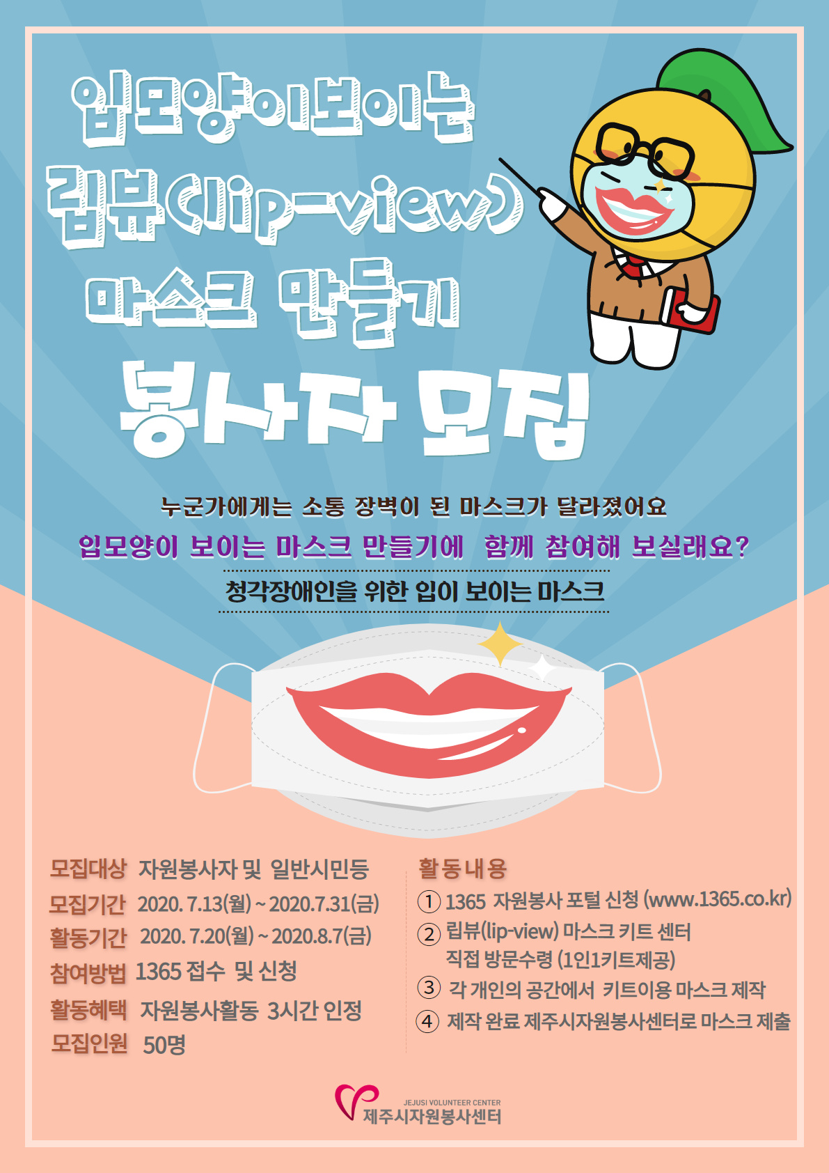 4> 활동내용 : 1365자원봉사포털신청 (www.1365.co.kr) - 센터 방문 립뷰(lip-vies)마스크 키트 직접 수령 (대리 수령 안됨) - 각 개인의 공간에서 키트 이용 마스크 제작(청각장애인이 사용할 마스크라 깨끗한 환경에서 마스크 제작)- 제작 완료 후 센터로 제출
