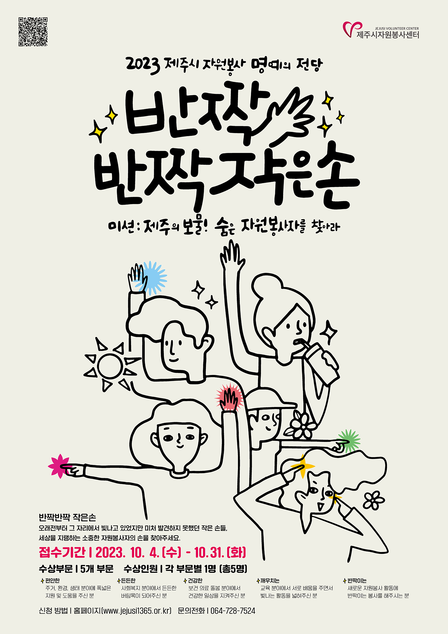 13.기타사항 ○제출서류 서식은 제주시자원봉사센터 홈페이지(www.jejusi1365.or.kr→공지사항→2023제주시 자원봉사 명예의 전당 공고)에서 내려받을 수 있습니다. ○수상자의 공적은 영상 제작되어 제주시자원봉사센터 홈페이지 ‘베스트 오브 베스트’ 제주시민 투표 시 홍보자료로 소개됩니다. ○수상자 선정과 시상에 따른 추후 일정이 변경될 수 있습니다. ○증빙자료 미제출 및 공적 내용이 사실과 다를 경우 수상자에서 제외될 수 있습니다. ○심사 시 부문별 수상자를 결정함에 있어 적합한 자가 없을 경우에는 선정하지 않을 수 있습니다. ○기타 자세한 사항은 제주시자원봉사센터(☎064-728-7524)로 문의하여 주시기 바랍니다.